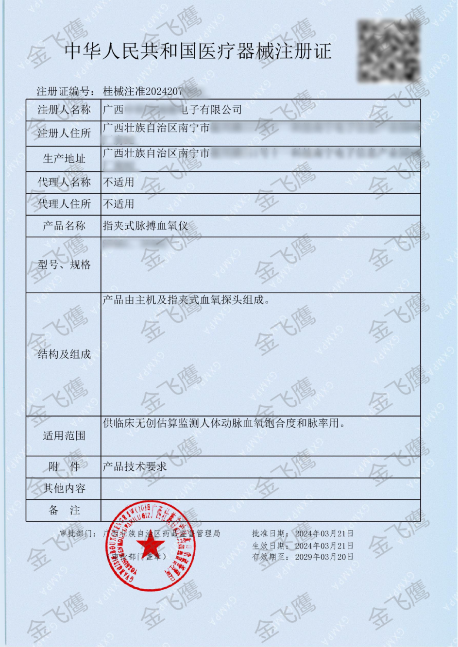 近日,金飛鷹成功輔導廣西一家企業(yè)取得了【指夾式脈搏血氧儀】的注冊證,借此機會,我們又給大家?guī)硪徊ㄑ鮾x產(chǎn)品的注冊干貨。