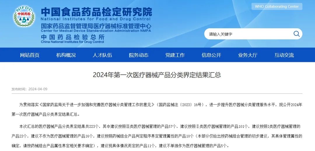 4月9日,國家藥監(jiān)局醫(yī)療器械標(biāo)準(zhǔn)管理中心發(fā)布《2024年第一次醫(yī)療器械產(chǎn)品分類界定結(jié)果匯總》,本次共匯總了223個(gè)醫(yī)療器械產(chǎn)品分類界定結(jié)果,其中建議按照Ⅲ類醫(yī)療器械管理的產(chǎn)品57個(gè),建議按照Ⅱ類醫(yī)療器械管理的產(chǎn)品101個(gè),建議按照Ⅰ類醫(yī)療器械管理的產(chǎn)品23個(gè),建議不作為醫(yī)療器械管理的產(chǎn)品16個(gè),建議按照藥械組合產(chǎn)品判定程序界定管理屬性的產(chǎn)品10個(gè),建議視具體情況而定的產(chǎn)品11個(gè),建議不單獨(dú)作為醫(yī)療器械管理的產(chǎn)品5個(gè)。