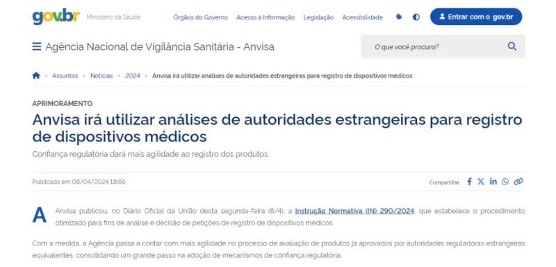 近日,Anvisa發(fā)布第290/2024號(hào)規(guī)范性指令,規(guī)定了審核和決定醫(yī)療器械注冊(cè)申請(qǐng)的簡(jiǎn)化程序:經(jīng)認(rèn)可的海外監(jiān)管機(jī)構(gòu)(澳洲、加拿大、美國(guó)、日本)授權(quán)上市的Class Ⅲ、Class Ⅳ類高風(fēng)險(xiǎn)醫(yī)療器械,可根據(jù)公司的申請(qǐng)縮短其在巴西注冊(cè)的審核時(shí)間。此簡(jiǎn)化程序的申請(qǐng)需提交相關(guān)文件,以證明進(jìn)入巴西市場(chǎng)的產(chǎn)品與經(jīng)認(rèn)可的監(jiān)管機(jī)構(gòu)批準(zhǔn)的產(chǎn)品有著相同的生產(chǎn)特征、適應(yīng)癥和預(yù)期用途。