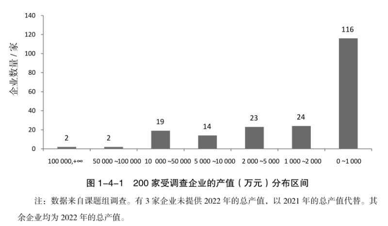 調(diào)查結(jié)果顯示,2022年,200家受調(diào)查注冊企業(yè)的總產(chǎn)值加總約為129.4億元(個別企業(yè)尚未公布2022年的總產(chǎn)值,以2021年的總產(chǎn)值代替),員工人數(shù)總計20029人,平均每家企業(yè)產(chǎn)值約為6460萬元,平均雇傭的員工人數(shù)為100人,人均產(chǎn)值約為64.6萬元。