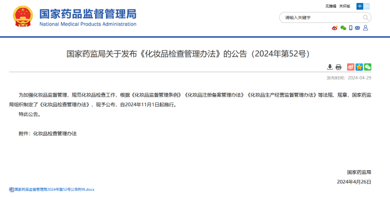近日,國家藥監(jiān)局發(fā)布《化妝品監(jiān)督管理辦法》。這是我國化妝品監(jiān)管領(lǐng)域第一次系統(tǒng)地規(guī)范化妝品檢查工作,自2024年11月1日開始實施。