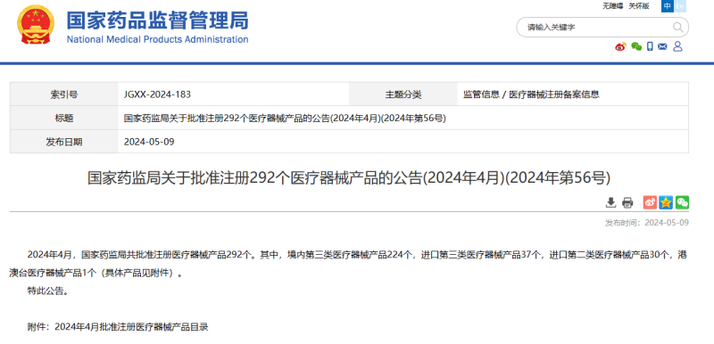 國家藥監(jiān)局發(fā)布,2024年4月共批準(zhǔn)292個醫(yī)療器械。1月-4月以來國家藥監(jiān)局共批準(zhǔn)注冊了1131個醫(yī)療器械產(chǎn)品。