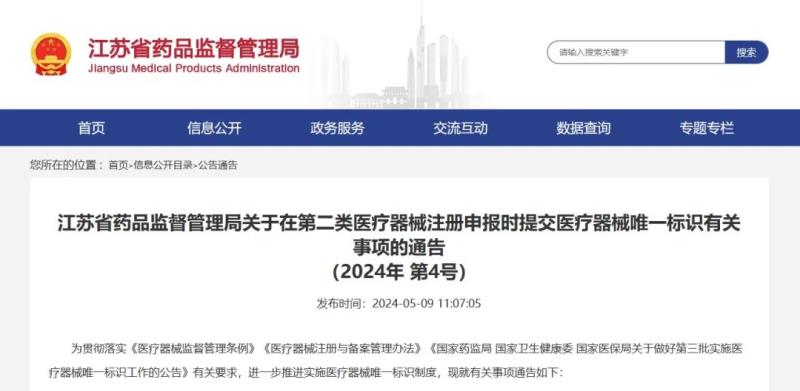 隨著第三批醫(yī)療器械唯一標識實施日期的臨近,近日,江蘇省藥監(jiān)局發(fā)布《關于在第二類醫(yī)療器械注冊申報時提交醫(yī)療器械唯一標識有關事項的通告(2024年 第4號)》,具體如下: