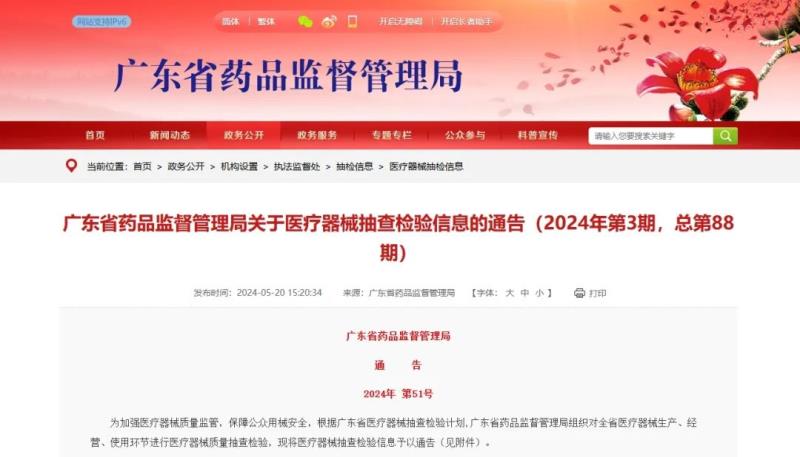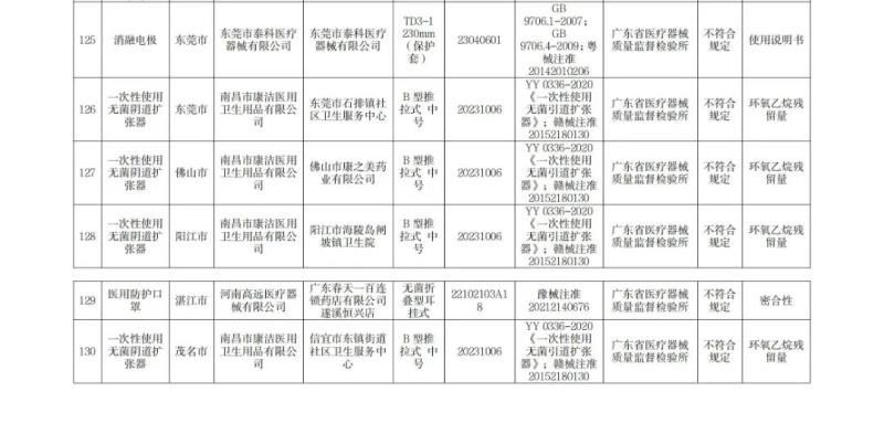 5月20日,廣東省藥監(jiān)局發(fā)布《關(guān)于醫(yī)療器械抽查檢驗(yàn)信息的通告(2024年第3期,總第88期)》(以下簡(jiǎn)稱《通告》),《通告》顯示,該局共抽檢了130批次產(chǎn)品,共有6批次不合格,不合格產(chǎn)品包括消融電極、一次性使用無(wú)菌陰道擴(kuò)張器、醫(yī)用防護(hù)口罩,具體如下: