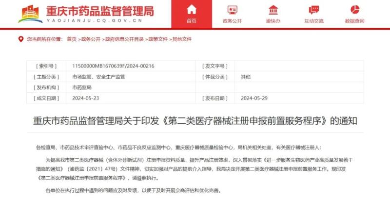 為提高我市第二類醫(yī)療器械(含體外診斷試劑)注冊申報資料質量,提升產(chǎn)品注冊效率,深入貫徹落實《進一步服務生物醫(yī)藥產(chǎn)業(yè)高質量發(fā)展若干措施的通知》(渝藥監(jiān)〔2021〕47號)文件精神,切實加強對產(chǎn)品的提前介入指導,我局決定開展第二類醫(yī)療器械注冊申報前置服務工作。