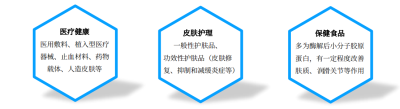 膠原蛋白因?yàn)樵诠I(yè)上有廣泛的應(yīng)用,被認(rèn)為是用途最廣泛的生物材料之一。由于其高蛋白質(zhì)含量以及諸如吸水性、凝膠形成性和乳化穩(wěn)定性的功能性屬性,在食品工業(yè)中對(duì)膠原蛋白有著巨大的需求。在生物醫(yī)學(xué)和制藥領(lǐng)域,膠原蛋白有著多種應(yīng)用,被用作藥物、蛋白質(zhì)和基因的載體,同時(shí)也可作為人造人類(lèi)皮膚、血管和韌帶的替代品。