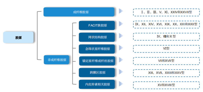 按照被發(fā)現(xiàn)的先后順序,膠原蛋白可分為Ⅰ型膠原、Ⅱ型膠原和Ⅲ型膠原,以此類(lèi)推。對(duì)人體來(lái)說(shuō),最常見(jiàn)的膠原主要有四種形態(tài):① 膠原Ⅰ型(主要存在于成人皮膚和骨組織,數(shù)量最大);② 膠原Ⅱ型(主要存在于軟骨組織);③ 膠原Ⅲ型(主要存在于嬰幼兒皮膚或血管、內(nèi)膜、腸、胃器官);④ 膠原Ⅳ型(主要存在于各組織器官的基底膜、胎盤(pán)和晶狀體)。