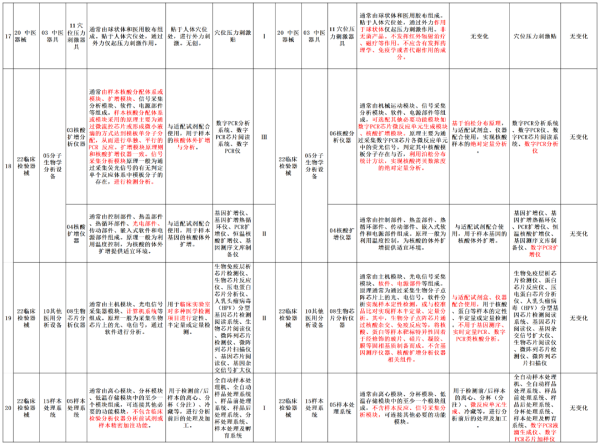 本次調(diào)整意見對20類醫(yī)療器械產(chǎn)品進行了產(chǎn)品描述、預(yù)期用途或管理類別的調(diào)整,我們以圖片形式將其展示如下(點擊圖片可放大查看):