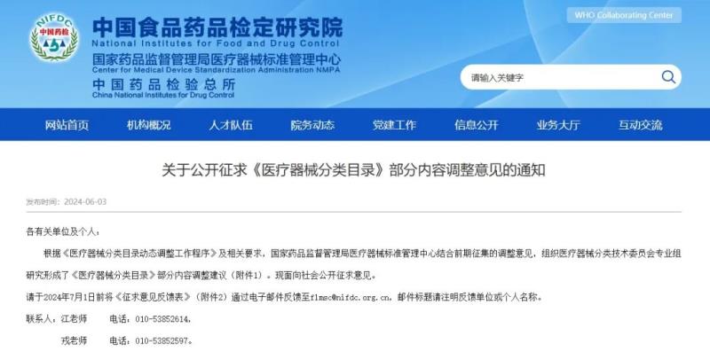 6月3日,國家藥監(jiān)局醫(yī)療器械標管中心發(fā)布《關(guān)于公開征求〈醫(yī)療器械分類目錄〉部分內(nèi)容調(diào)整意見的通知》,并向社會公開征求意見。