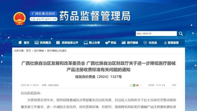 6月11日,廣西壯族自治區(qū)藥監(jiān)局發(fā)布《廣西壯族自治區(qū)發(fā)展和改革委員會 廣西壯族自治區(qū)財政廳關(guān)于進(jìn)一步降低醫(yī)療器械產(chǎn)品注冊收費(fèi)標(biāo)準(zhǔn)有關(guān)問題的通知》,宣布將境內(nèi)第二類醫(yī)療器械產(chǎn)品首次注冊費(fèi)由30280元降為20187元;延續(xù)注冊費(fèi)由12560元降為零,具體內(nèi)容如下: