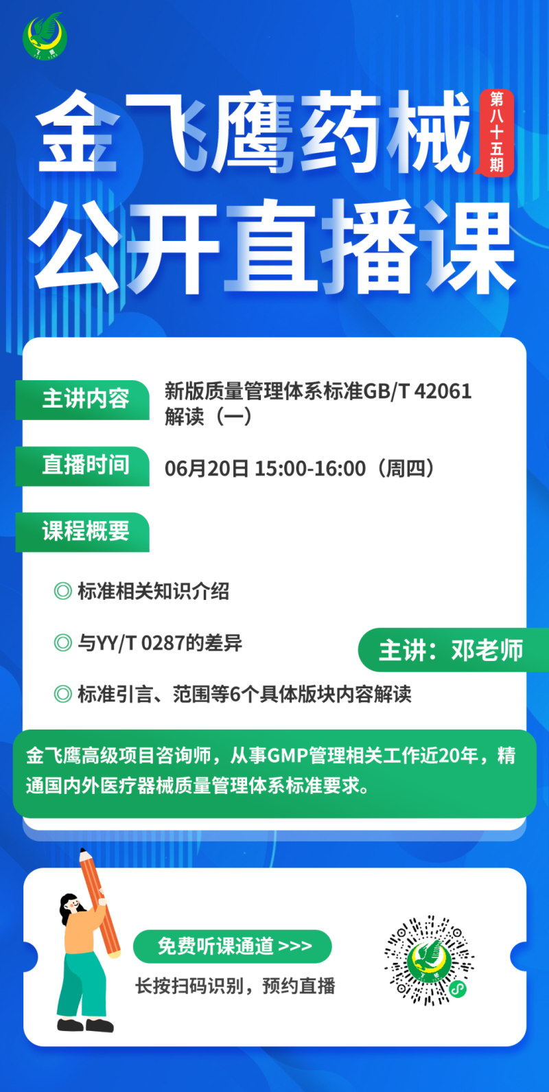 6月20日下午3點,金飛鷹高級項目咨詢師,從事GMP管理相關(guān)工作近20年,精通國內(nèi)外醫(yī)療器械質(zhì)量管理體系標準要求的鄧老師,給大家?guī)怼缎掳驷t(yī)療器械質(zhì)量管理體系標準GB/T 42061解讀(一)》,培訓內(nèi)容包括標準相關(guān)知識介紹、與YY/T 0287的差異、標準引言/范圍等6個具體版塊內(nèi)容解讀,醫(yī)療器械經(jīng)營企業(yè)千萬不要錯過了哦!