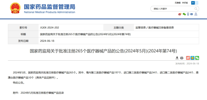 6月18日,國(guó)家藥監(jiān)局官網(wǎng)發(fā)布公告稱(chēng),2024年5月,國(guó)家藥監(jiān)局共批準(zhǔn)注冊(cè)醫(yī)療器械產(chǎn)品265個(gè)。其中,境內(nèi)第三類(lèi)醫(yī)療器械產(chǎn)品197個(gè),進(jìn)口第三類(lèi)醫(yī)療器械產(chǎn)品34個(gè),進(jìn)口第二類(lèi)醫(yī)療器械產(chǎn)品24個(gè),港澳臺(tái)醫(yī)療器械產(chǎn)品10個(gè)。