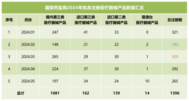 我們同步匯總了2024年前五個(gè)月國(guó)家藥監(jiān)局批準(zhǔn)注冊(cè)的醫(yī)療器械產(chǎn)品數(shù)量(見(jiàn)下方表格),從表格中可以看出,截至5月,2024年國(guó)家藥監(jiān)局總計(jì)批準(zhǔn)注冊(cè)醫(yī)療器械產(chǎn)品1396個(gè),其中境內(nèi)第三類(lèi)醫(yī)療器械產(chǎn)品1081個(gè),進(jìn)口第三類(lèi)醫(yī)療器械產(chǎn)品162個(gè),進(jìn)口第二類(lèi)醫(yī)療器械產(chǎn)品139個(gè),港澳臺(tái)醫(yī)療器械產(chǎn)品14個(gè)。