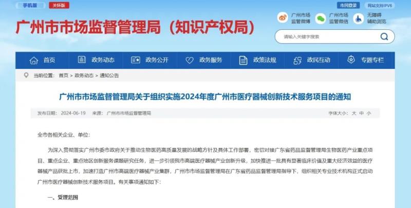6月19日,廣州市市場(chǎng)監(jiān)督管理局發(fā)布《關(guān)于組織實(shí)施2024年度廣州市醫(yī)療器械創(chuàng)新技術(shù)服務(wù)項(xiàng)目的通知》(以下簡(jiǎn)稱(chēng)《通知》),《通知》指出,該局已組織相關(guān)專(zhuān)業(yè)技術(shù)機(jī)構(gòu)正式啟動(dòng)廣州市醫(yī)療器械創(chuàng)新技術(shù)服務(wù)項(xiàng)目。具體事項(xiàng)如下: