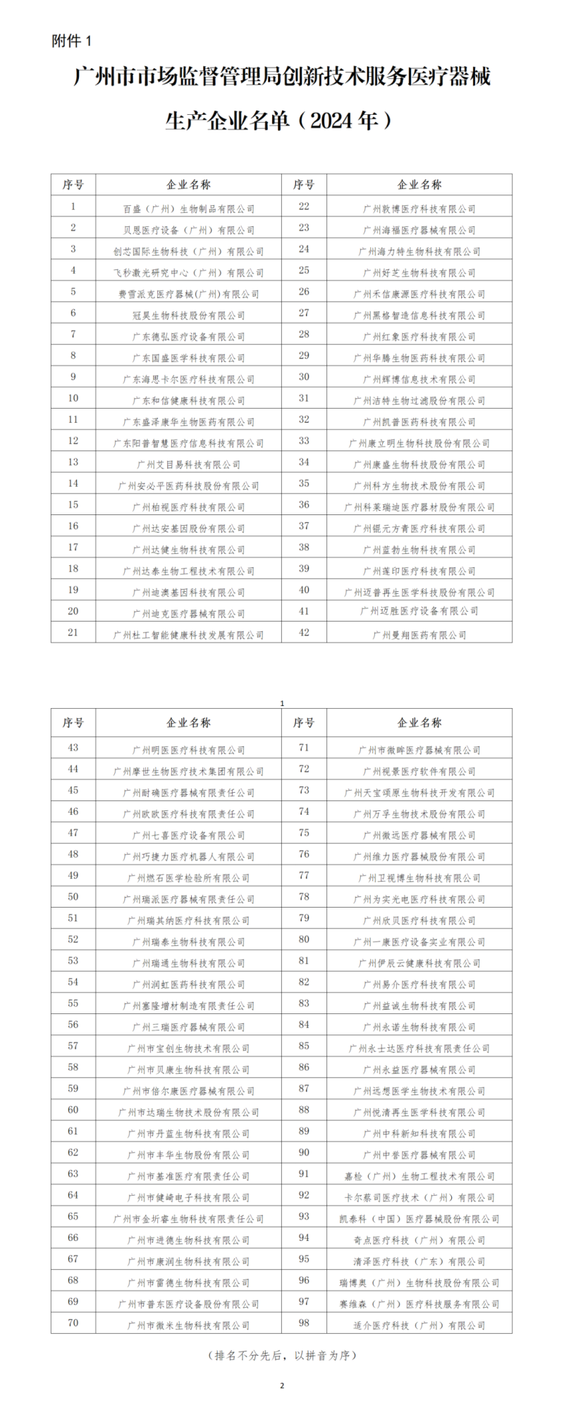 經(jīng)前期遴選,納入《廣州市市場(chǎng)監(jiān)督管理局創(chuàng)新技術(shù)服務(wù)醫(yī)療器械生產(chǎn)企業(yè)名單(2024年)》的企業(yè)(簡(jiǎn)稱(chēng)《名單》,見(jiàn)下方附件圖片),共包括廣州紅象醫(yī)療科技有限公司、廣州科萊瑞迪醫(yī)療器材股份有限公司、廣州黑格智造信息科技有限公司等98家企業(yè),原則上每家企業(yè)自主選擇不多于三個(gè)擬注冊(cè)單元。