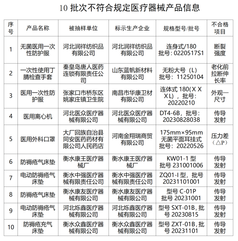 為加強醫(yī)療器械質量監(jiān)督管理,保障醫(yī)療器械質量安全有效,按照《醫(yī)療器械監(jiān)督管理條例》及《河北省醫(yī)療器械監(jiān)督抽驗管理辦法》有關規(guī)定,河北省藥品監(jiān)督管理局組織對2023年全省生產、經營和使用等環(huán)節(jié)醫(yī)療器械進行了質量監(jiān)督抽檢,發(fā)現10批次產品不符合標準規(guī)定,并已依法分別予以查處,現予以公開。