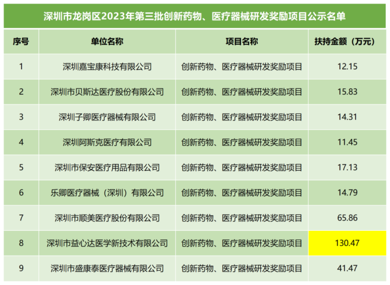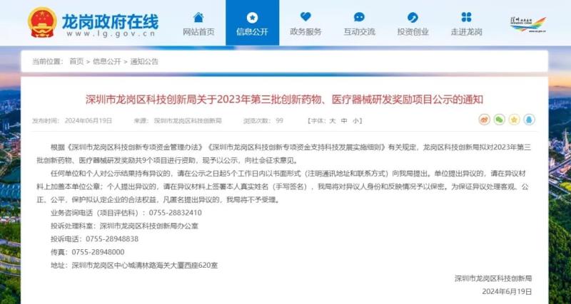 6月19日,深圳市龍崗區(qū)科技創(chuàng)新局對外公示了9個2023年第三批創(chuàng)新藥物、醫(yī)療器械研發(fā)獎勵項目,最高擬資助130.47萬元,具體明細如下: