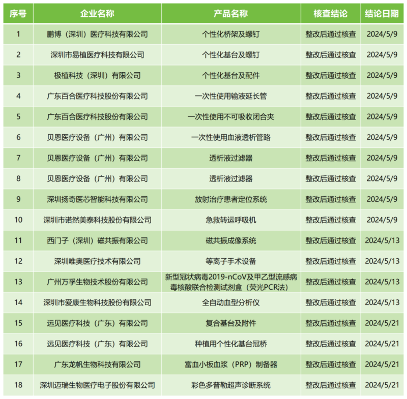 6月25日,廣東省藥監(jiān)局官網(wǎng)公布2024年5月醫(yī)療器械注冊質(zhì)量管理體系核查結(jié)果,包括西門子(深圳)磁共振有限公司的磁共振成像系統(tǒng)、深圳唯奧醫(yī)療技術(shù)有限公司的等離子手術(shù)設備、深圳邁瑞生物醫(yī)療電子股份有限公司的彩色多普勒超聲診斷系統(tǒng)等共計18款產(chǎn)品,均為“整改后通過核查”。具體明細見下方表格: