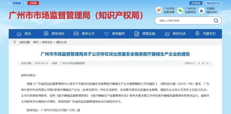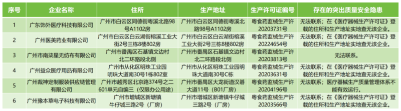 近日,廣州市市場監(jiān)督管理局發(fā)布《關(guān)于公示存在突出質(zhì)量安全隱患醫(yī)療器械生產(chǎn)企業(yè)的通告》,其中指出,廣東飾外醫(yī)療科技有限公司、廣州醫(yī)美藥業(yè)有限公司等6家醫(yī)療器械生產(chǎn)企業(yè)存在存在無法聯(lián)系、實地查無等突出質(zhì)量安全隱患,具體名單如下: