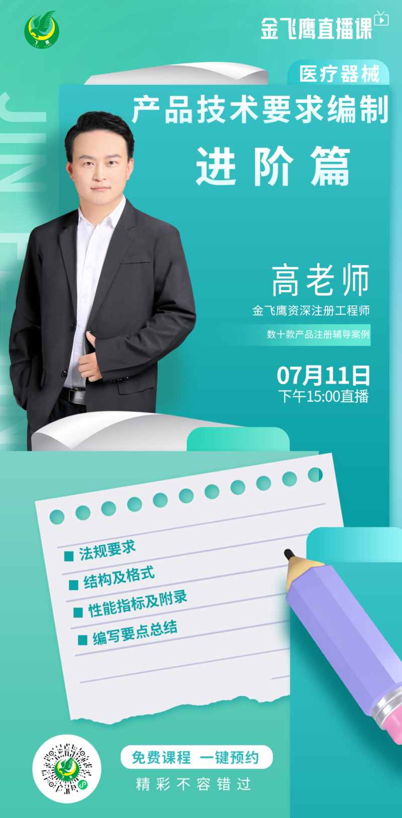 醫(yī)療器械產(chǎn)品技術(shù)要求是確保產(chǎn)品質(zhì)量和安全的關(guān)鍵因素之一。在產(chǎn)品研發(fā)階段,企業(yè)應(yīng)根據(jù)產(chǎn)品相關(guān)標(biāo)準(zhǔn)/指導(dǎo)原則或擬實(shí)現(xiàn)的預(yù)期用途制定技術(shù)要求;在產(chǎn)品注冊(cè)階段,產(chǎn)品技術(shù)要求作為一項(xiàng)極為重要的注冊(cè)申報(bào)資料,是醫(yī)療器械技術(shù)審評(píng)機(jī)構(gòu)進(jìn)行技術(shù)審查時(shí)的重要關(guān)注點(diǎn);而到了生產(chǎn)階段,企業(yè)應(yīng)嚴(yán)格按照經(jīng)注冊(cè)或者備案的產(chǎn)品技術(shù)要求組織生產(chǎn),保證出廠的醫(yī)療器械符合強(qiáng)制性標(biāo)準(zhǔn)以及經(jīng)注冊(cè)或者備案的產(chǎn)品技術(shù)要求。《醫(yī)療器械監(jiān)督管理?xiàng)l例》《醫(yī)療器械注冊(cè)與備案管理辦法》等法規(guī)對(duì)于產(chǎn)品技術(shù)要求都有相應(yīng)的條款要求,而為進(jìn)一步規(guī)范產(chǎn)品技術(shù)要求的編寫,2022年,國(guó)家藥監(jiān)局組織修訂了《醫(yī)療器械產(chǎn)品技術(shù)要求編寫指導(dǎo)原則》(以下簡(jiǎn)《指導(dǎo)原則》)。無(wú)疑,《指導(dǎo)原則》對(duì)產(chǎn)品技術(shù)要求的編寫有著一定的指導(dǎo)意義,但在金飛鷹的日常輔導(dǎo)中我們發(fā)現(xiàn),企業(yè)在編制產(chǎn)品技術(shù)要求時(shí)仍存在諸多問(wèn)題,比如性能指標(biāo)的制定、附錄部分的內(nèi)容安排等。經(jīng)常關(guān)注我們的朋友也許還記得,此前我們給大家講過(guò)一期有關(guān)有源醫(yī)療器械產(chǎn)品技術(shù)要求編寫的培訓(xùn),那么本期則針對(duì)所有醫(yī)療器械產(chǎn)品,給大家?guī)?lái)產(chǎn)品技術(shù)要編制的【進(jìn)階篇】,掌握了課程精髓,你也可以獨(dú)立編寫產(chǎn)品技術(shù)要求啦~7月11日下午3點(diǎn),金飛鷹資深注冊(cè)工程師,擁有多年醫(yī)療器械行業(yè)經(jīng)驗(yàn),成功輔導(dǎo)數(shù)十款產(chǎn)品合規(guī)上市的高老師,給大家?guī)?lái)《醫(yī)療器械產(chǎn)品技術(shù)要求編制-進(jìn)階篇》,培訓(xùn)內(nèi)容包括法規(guī)要求、結(jié)構(gòu)及格式、性能指標(biāo)及附錄、編寫要點(diǎn)總結(jié),大家千萬(wàn)不要錯(cuò)過(guò)了哦!