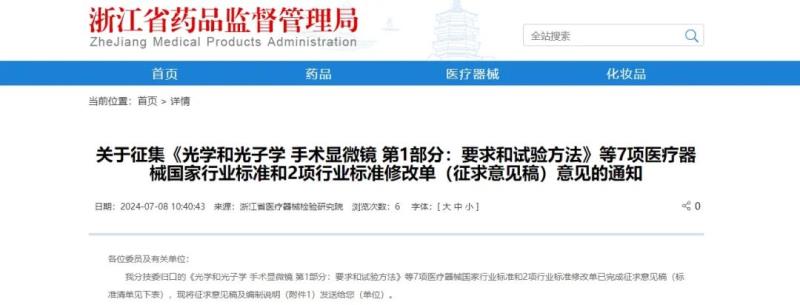 7月8日,浙江省藥監(jiān)局轉(zhuǎn)載了浙江省醫(yī)療器械檢驗研究院有關(guān)征集《光學和光子學 手術(shù)顯微鏡 第1部分:要求和試驗方法》《強脈沖光治療設備》等7項醫(yī)療器械國家/行業(yè)標準和2項行業(yè)標準修改單意見的通知,具體標準清單如下: