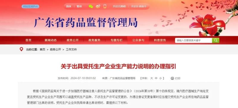 7月10日,廣東省藥監(jiān)局發(fā)布《關(guān)于出具受托生產(chǎn)企業(yè)生產(chǎn)能力說明的辦理指引》,其中提到,根據(jù)《國家藥監(jiān)局關(guān)于進(jìn)一步加強醫(yī)療器械注冊人委托生產(chǎn)監(jiān)督管理的公告》(2024年第38號)第十四條規(guī)定,境內(nèi)醫(yī)療器械生產(chǎn)地址變更且受托生產(chǎn)企業(yè)生產(chǎn)范圍可以涵蓋受托生產(chǎn)品種,不涉及生產(chǎn)許可證變更的,辦理注冊證變更備案時應(yīng)當(dāng)提交受托生產(chǎn)企業(yè)所在地藥品監(jiān)督管理部門出具的說明。