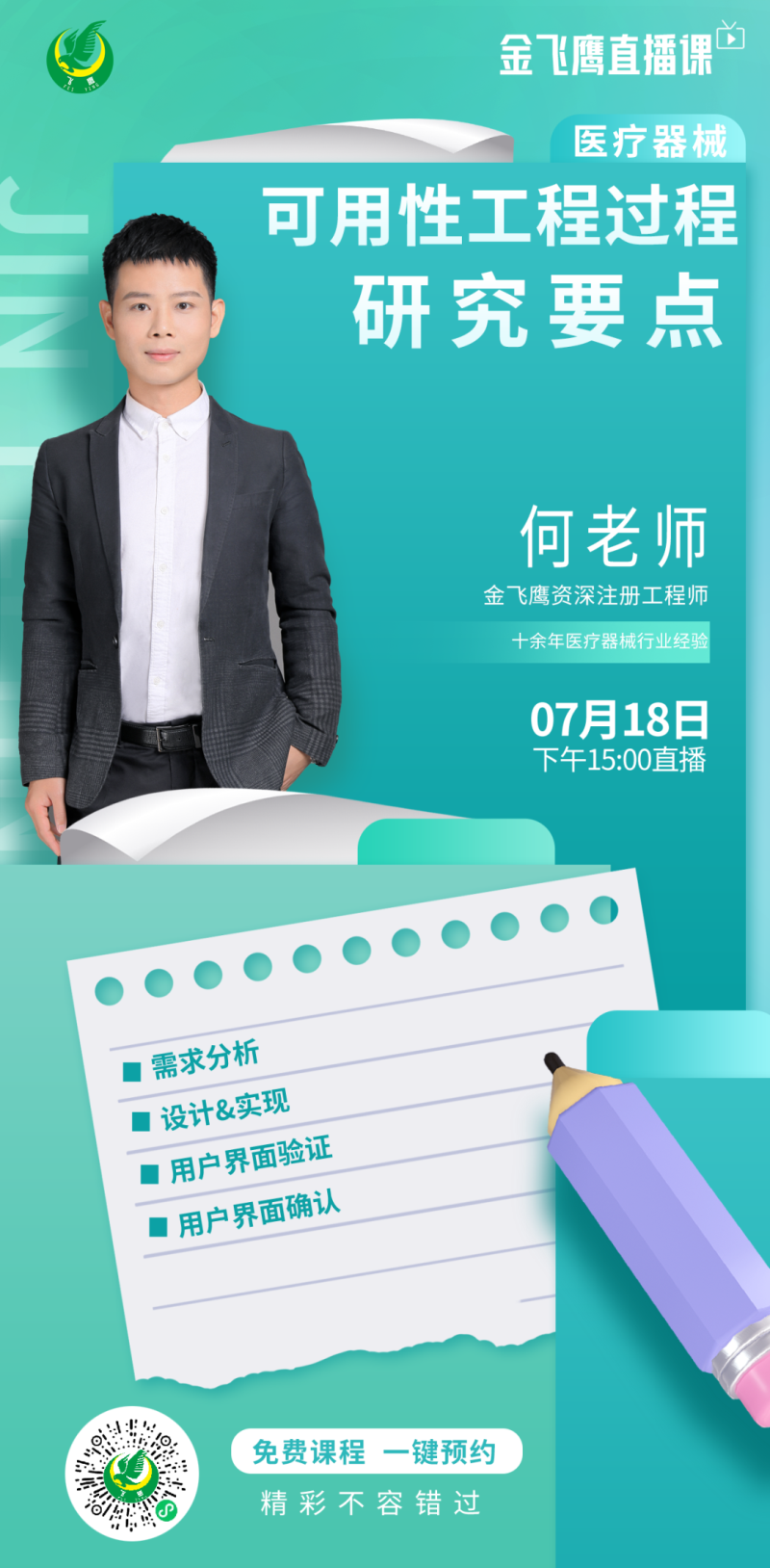 7月18日下午3點(diǎn),金飛鷹資深注冊(cè)工程師,擁有十余年醫(yī)療器械行業(yè)經(jīng)驗(yàn),對(duì)可用性工程頗有研究的何老師,繼續(xù)給大家?guī)怼夺t(yī)療器械可用性工程過程研究要點(diǎn)》,培訓(xùn)內(nèi)容包括需求分析、設(shè)計(jì)&實(shí)現(xiàn)、用戶界面驗(yàn)證、用戶界面確認(rèn),大家千萬不要錯(cuò)過了哦!