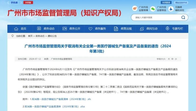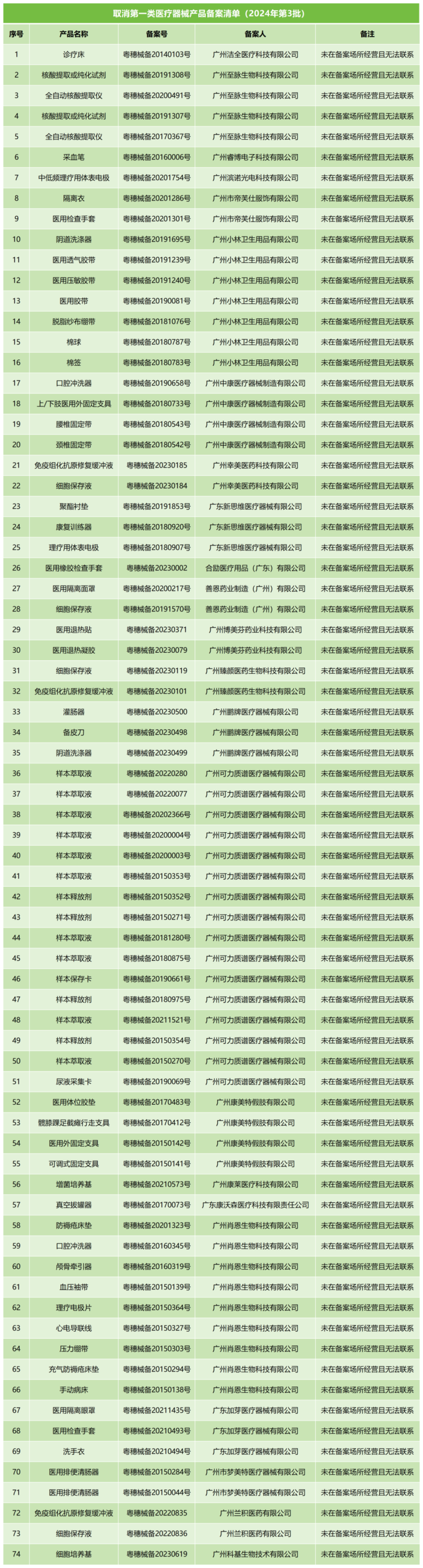 近日,廣州市市場監(jiān)督管理局官網(wǎng)發(fā)布一則取消第一類醫(yī)療器械生產(chǎn)備案及產(chǎn)品備案的通告,通告指出,因廣州至脈生物科技有限公司、廣州小林衛(wèi)生用品有限公司、廣州中康醫(yī)療器械制造有限公司等第一類醫(yī)械產(chǎn)品備案人未在備案場所經(jīng)營且無法聯(lián)系,該局在公示期結(jié)束后決定取消這些企業(yè)名下的74個第一類醫(yī)療器械產(chǎn)品備案,具體明細(xì)如下: