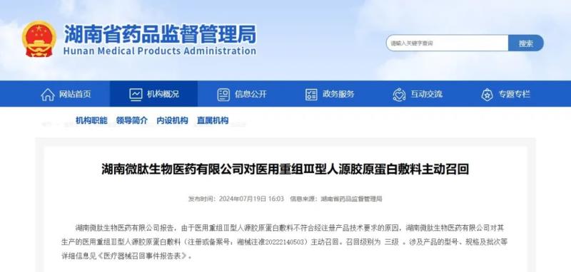 近日,湖南省藥監(jiān)局發(fā)布公告稱,據(jù)湖南微肽生物醫(yī)藥有限公司報(bào)告,由于醫(yī)用重組Ⅲ型人源膠原蛋白敷料不符合經(jīng)注冊(cè)產(chǎn)品技術(shù)要求(具體情況:經(jīng)廣東省醫(yī)療器械抽檢,該批號(hào)產(chǎn)品裝量標(biāo)示規(guī)格3ml,實(shí)際檢測(cè)結(jié)果3.5ml),湖南微肽生物醫(yī)藥有限公司對(duì)其生產(chǎn)的醫(yī)用重組Ⅲ型人源膠原蛋白敷料(注冊(cè)證編號(hào):湘械注準(zhǔn)20222140503)主動(dòng)召回。召回級(jí)別為三級(jí)。