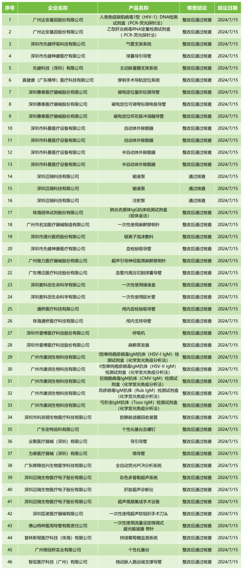 8月6日,廣東省藥監(jiān)局官網(wǎng)公布2024年7月醫(yī)療器械注冊質量管理體系核查結果,包括深圳市科曼醫(yī)療設備有限公司的自動體外除顫器、深圳邁瑞科技有限公司的輸液泵、深圳市源興醫(yī)藥股份有限公司的銀離子泡沫敷料等共計46款產(chǎn)品,其中深圳邁瑞科技有限公司的3款產(chǎn)品為“通過核查”,其余均為“整改后通過核查”。具體明細見下方表格:
