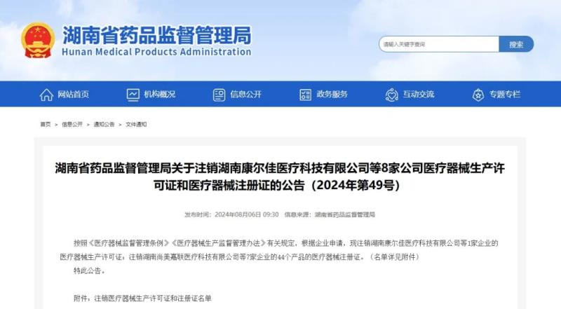 8月6日,湖南省藥監(jiān)局發(fā)布公告稱,按照《醫(yī)療器械監(jiān)督管理?xiàng)l例》《醫(yī)療器械生產(chǎn)監(jiān)督管理辦法》有關(guān)規(guī)定,根據(jù)企業(yè)申請(qǐng),現(xiàn)注銷湖南康爾佳醫(yī)療科技有限公司等1家企業(yè)的醫(yī)療器械生產(chǎn)許可證;注銷湖南尚美嘉聯(lián)醫(yī)療科技有限公司等7家企業(yè)的44個(gè)產(chǎn)品的醫(yī)療器械注冊(cè)證,具體明細(xì)如下: