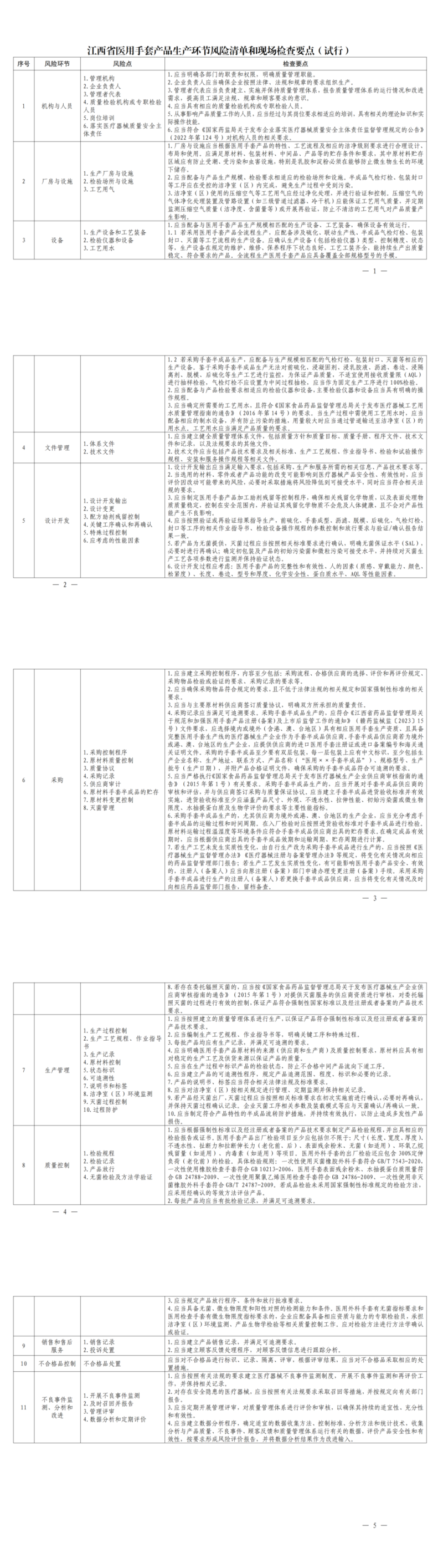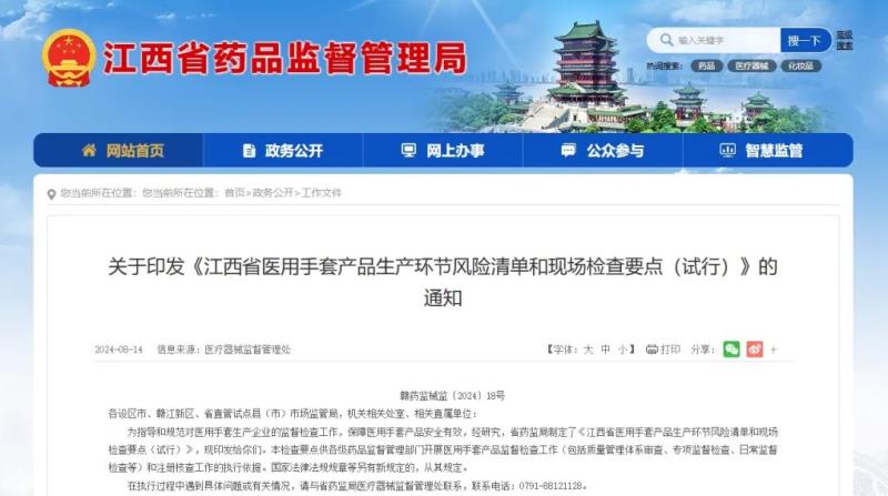 8月14日,江西省藥監(jiān)局發(fā)布《江西省醫(yī)用手套產(chǎn)品生產(chǎn)環(huán)節(jié)風險清單和現(xiàn)場檢查要點(試行)》(以下簡稱《檢查要點》),作為各級藥品監(jiān)督管理部門開展醫(yī)用手套產(chǎn)品監(jiān)督檢查工作(包括質(zhì)量管理體系審查、專項監(jiān)督檢查、日常監(jiān)督檢查等)和注冊核查工作的執(zhí)行依據(jù)。