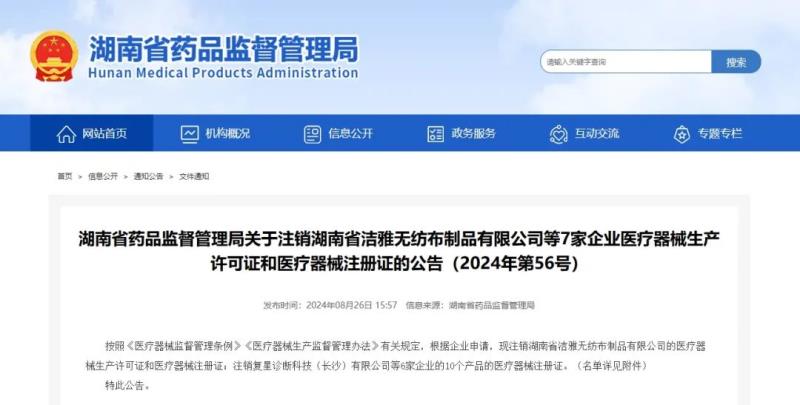 8月26日,湖南省藥監(jiān)局發(fā)布公告稱,按照《醫(yī)療器械監(jiān)督管理?xiàng)l例》《醫(yī)療器械生產(chǎn)監(jiān)督管理辦法》有關(guān)規(guī)定,根據(jù)企業(yè)申請,現(xiàn)注銷湖南省潔雅無紡布制品有限公司的醫(yī)療器械生產(chǎn)許可證和醫(yī)療器械注冊證;注銷復(fù)星診斷科技(長沙)有限公司6家企業(yè)的10個產(chǎn)品的醫(yī)療器械注冊證,具體明細(xì)如下:
