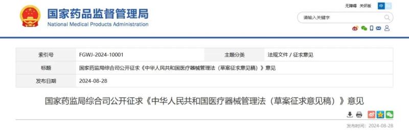8月28日,國家藥監(jiān)局發(fā)布《中華人民共和國醫(yī)療器械管理法(草案征求意見稿)》(以下簡稱《醫(yī)療器械管理法》),并向社會公開征求意見。意見反饋途徑和方式如下: