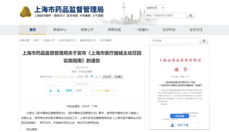 8月27日,上海市藥監(jiān)局發(fā)布《上海市醫(yī)療器械主動(dòng)召回實(shí)施指南》(以下簡(jiǎn)稱《實(shí)施指南》),以指導(dǎo)醫(yī)療器械注冊(cè)人備案人、經(jīng)營(yíng)企業(yè)、使用單位做好醫(yī)療器械主動(dòng)召回工作。