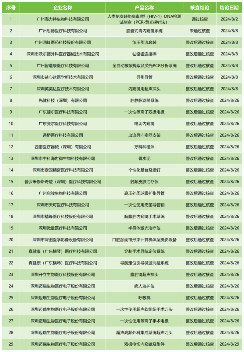 9月13日,廣東省藥監(jiān)局官網(wǎng)公布2024年8月醫(yī)療器械注冊質(zhì)量管理體系核查結(jié)果,包括普羅米修斯奇跡(深圳)醫(yī)療科技有限公司的射頻皮膚治療儀、深圳微量醫(yī)療科技有限公司的半導(dǎo)體激光治療儀、深圳邁瑞生物醫(yī)療電子股份有限公司的呼吸機(jī)等共計29款產(chǎn)品,其中廣州海力特生物科技有限公司的人類免疫缺陷病毒I型(HIV-1)DNA檢測試劑盒(PCR-熒光探針法)核查結(jié)論為“通過核查”,廣州思德醫(yī)療科技有限公司的膠囊式胃內(nèi)窺鏡系統(tǒng)核查結(jié)論為“未通過核查”,其余均為“整改后通過核查”。具體明細(xì)見下方表格: