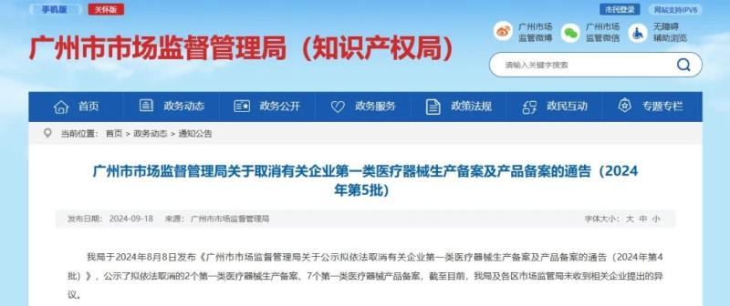 9月18日,廣州市市場(chǎng)監(jiān)督管理局官網(wǎng)發(fā)布一則取消第一類(lèi)醫(yī)療器械生產(chǎn)備案及產(chǎn)品備案的通告,通告指出,因廣東嘉雅醫(yī)療器械有限公司、廣州市歐之康醫(yī)療器械有限公司未在備案場(chǎng)所經(jīng)營(yíng)且無(wú)法聯(lián)系,在公示期間該局及各區(qū)市場(chǎng)監(jiān)管局未收到相關(guān)企業(yè)提出的異議。