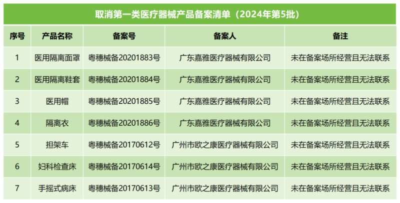 因此,該局現(xiàn)公告取消以上兩家企業(yè)的2個(gè)第一類(lèi)醫(yī)療器械生產(chǎn)備案(備案號(hào)分別為粵穗食藥監(jiān)械生產(chǎn)備20200352號(hào)&粵穗食藥監(jiān)械生產(chǎn)備20170092號(hào)),以及7個(gè)第一類(lèi)醫(yī)療器械產(chǎn)品備案,其中產(chǎn)品備案取消的具體清單如下: