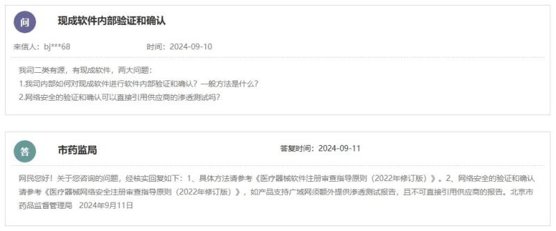 根據(jù)北京市藥監(jiān)局的答復(fù),軟件驗證和確認(rèn)具體方法可參考《醫(yī)療器械軟件注冊審查指導(dǎo)原則(2022年修訂版)》;網(wǎng)絡(luò)安全的驗證和確認(rèn)則可參考《醫(yī)療器械網(wǎng)絡(luò)安全注冊審查指導(dǎo)原則(2022年修訂版)》,如產(chǎn)品支持廣域網(wǎng),需額外提供滲透測試報告,且不可直接引用供應(yīng)商的報告。