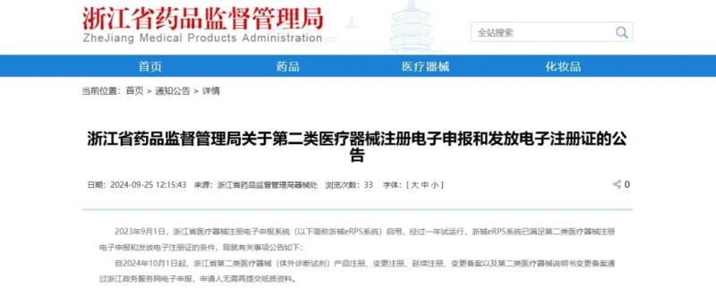 9月25日,浙江省藥監(jiān)局發(fā)布《關(guān)于第二類醫(yī)療器械注冊電子申報和發(fā)放電子注冊證的公告》,具體事項如下: