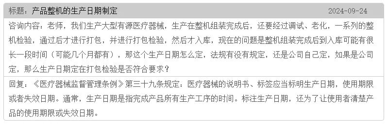 根據(jù)國家藥監(jiān)局食品藥品審核查驗中心的答復,《醫(yī)療器械監(jiān)督管理條例》第三十九條規(guī)定:醫(yī)療器械的說明書、標簽應當標明生產(chǎn)日期,使用期限或者失效日期。通常,生產(chǎn)日期是指完成產(chǎn)品所有生產(chǎn)工序的時間。標注生產(chǎn)日期,還為了讓使用者清楚產(chǎn)品的使用期限或失效日期。