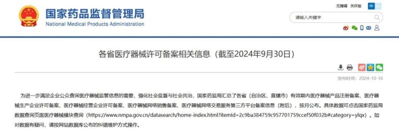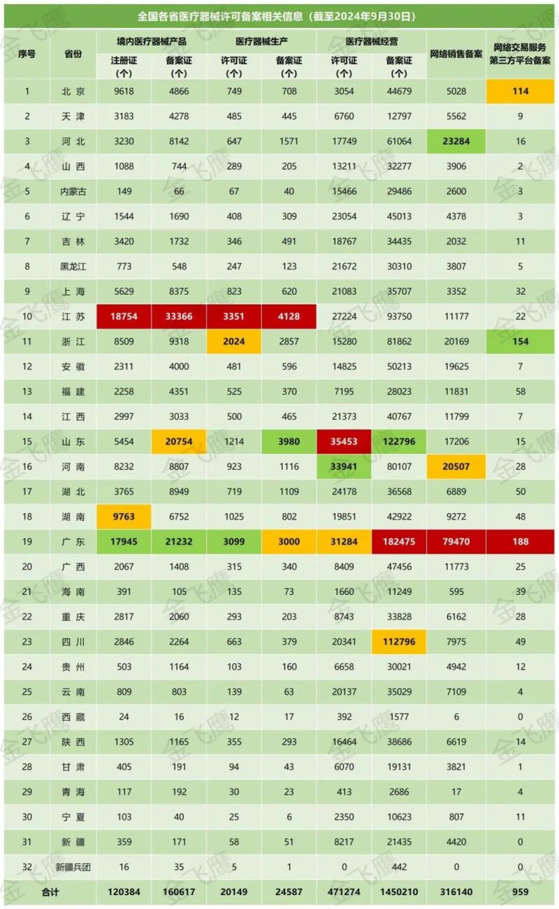 10月16日,國家藥監(jiān)局公布了截至2024年9月30日各省有效期內(nèi)醫(yī)療器械產(chǎn)品注冊備案、醫(yī)療器械生產(chǎn)企業(yè)許可備案等信息,老規(guī)矩,金飛鷹小編對此稍作編輯,標(biāo)注紅色、綠色、黃色的分別為前三甲。