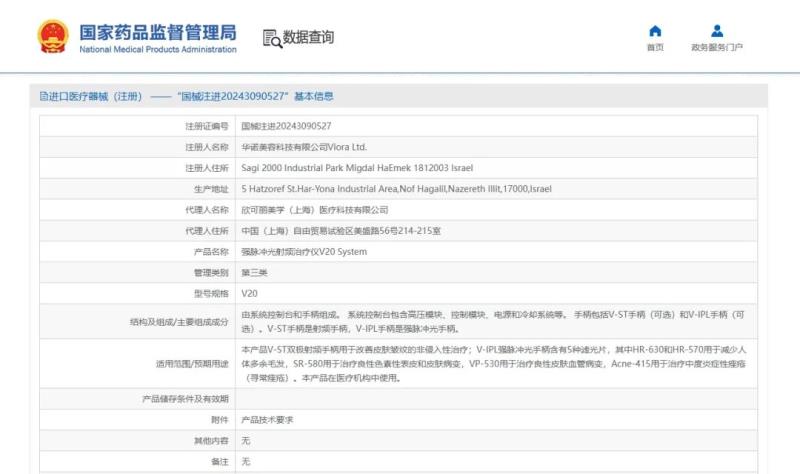 近日,國家藥監(jiān)局發(fā)布公告稱,2024年9月,國家藥監(jiān)局共批準(zhǔn)注冊(cè)醫(yī)療器械產(chǎn)品444個(gè)。在批準(zhǔn)注冊(cè)的產(chǎn)品清單附件中,有一款進(jìn)口第三類醫(yī)療器械引起了我們的注意——強(qiáng)脈沖光射頻治療儀。我們通過檢索附件中公布的注冊(cè)證編號(hào)發(fā)現(xiàn),該產(chǎn)品的注冊(cè)人是以色列華諾美容科技有限公司Viora Ltd.,國內(nèi)代理人則是華東醫(yī)藥的子公司欣可麗美學(xué)(上海)醫(yī)療科技有限公司。