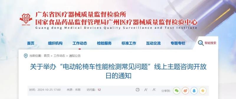 近日,廣東省醫(yī)療器械質(zhì)量監(jiān)督檢驗(yàn)所官網(wǎng)發(fā)布通知,定于10月31日(周四)舉辦“電動(dòng)輪椅車性能檢測常見問題”線上主題咨詢開放日活動(dòng),具體時(shí)間及參會(huì)方式如下: