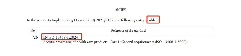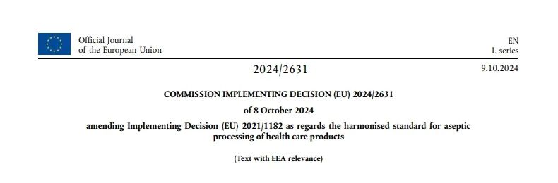 近日,歐盟官方日?qǐng)?bào)發(fā)布了EU 2024/2631:關(guān)于修訂(EU) 2021/1182號(hào)實(shí)施決定中有關(guān)保健品無菌加工的協(xié)調(diào)標(biāo)準(zhǔn)內(nèi)容。該標(biāo)準(zhǔn)的實(shí)施日期為2024年10月9日。