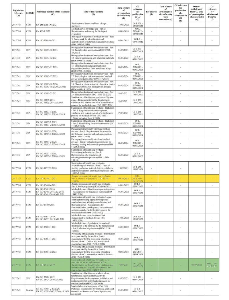 截至目前,歐盟MDR協(xié)調(diào)標(biāo)準(zhǔn)清單共計(jì)26項(xiàng)協(xié)調(diào)標(biāo)準(zhǔn),具體見下方圖片(其中標(biāo)黃的為本次更新標(biāo)準(zhǔn),標(biāo)綠的則為已經(jīng)撤銷的標(biāo)準(zhǔn)):