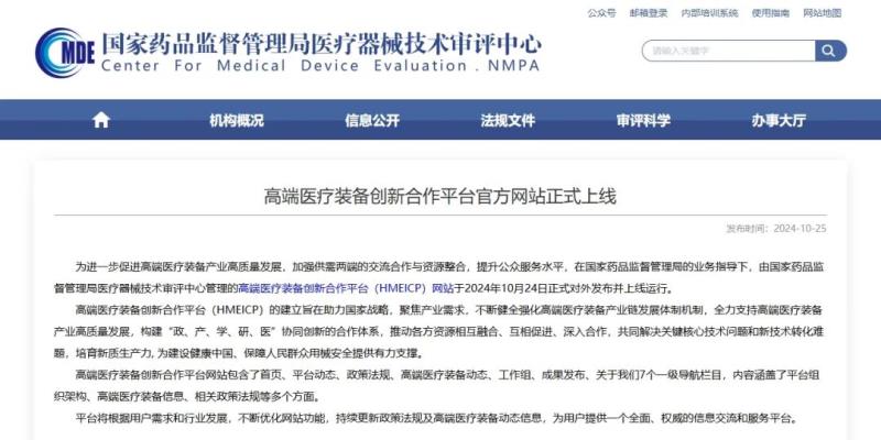 近日,國(guó)家藥監(jiān)局器審中心(以下簡(jiǎn)稱(chēng)“器審中心”)發(fā)布動(dòng)態(tài)稱(chēng),由器審中心管理的高端醫(yī)療裝備創(chuàng)新合作平臺(tái)(HMEICP)網(wǎng)站已于2024年10月24日正式對(duì)外發(fā)布并上線運(yùn)行。
