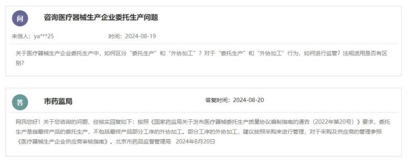 根據(jù)北京市藥監(jiān)局的答復(fù),按照《國家藥監(jiān)局關(guān)于發(fā)布醫(yī)療器械委托生產(chǎn)質(zhì)量協(xié)議編制指南的通告(2022年第20號)》要求,委托生產(chǎn)是指最終產(chǎn)品的委托生產(chǎn),不包括最終產(chǎn)品部分工序的外協(xié)加工。部分工序的外協(xié)加工,建議按照采購來進行管理,對于采購及供應(yīng)商的管理參照《醫(yī)療器械生產(chǎn)企業(yè)供應(yīng)商審核指南》。