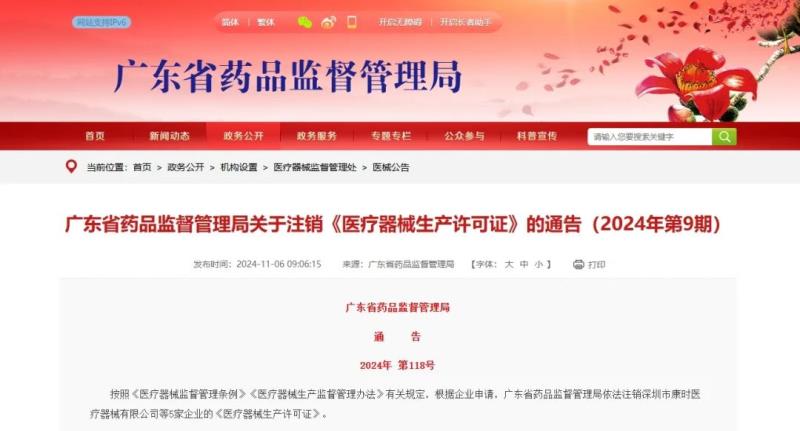 11月6日,廣東藥監(jiān)局發(fā)布通告稱,按照《醫(yī)療器械監(jiān)督管理條例》《醫(yī)療器械生產(chǎn)監(jiān)督管理辦法》有關(guān)規(guī)定,根據(jù)企業(yè)申請,該局已于依法注銷注銷深圳市康時醫(yī)療器械有限公司、深圳因賽德思醫(yī)療科技有限公司等5家企業(yè)的《醫(yī)療器械生產(chǎn)許可證》,具體明細如下: