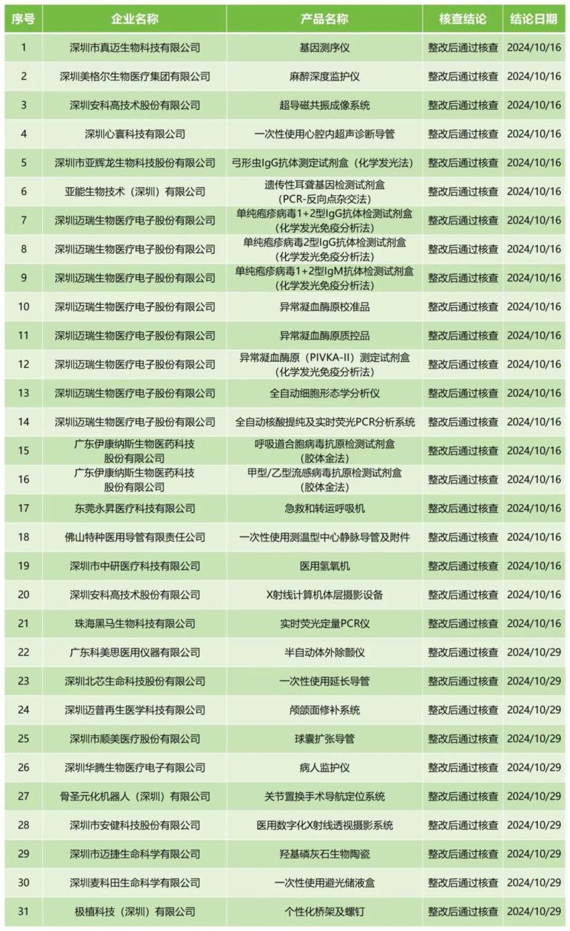 11月11日,廣東省藥監(jiān)局官網(wǎng)公布2024年10月醫(yī)療器械注冊質量管理體系核查結果,包括深圳市真邁生物科技有限公司的基因測序儀、深圳市中研醫(yī)療科技有限公司的醫(yī)用氫氧機、廣東科美思醫(yī)用儀器有限公司的半自動體外除顫儀等共計31款產(chǎn)品,核查結論均為“整改后通過核查”。具體明細見下方表格: